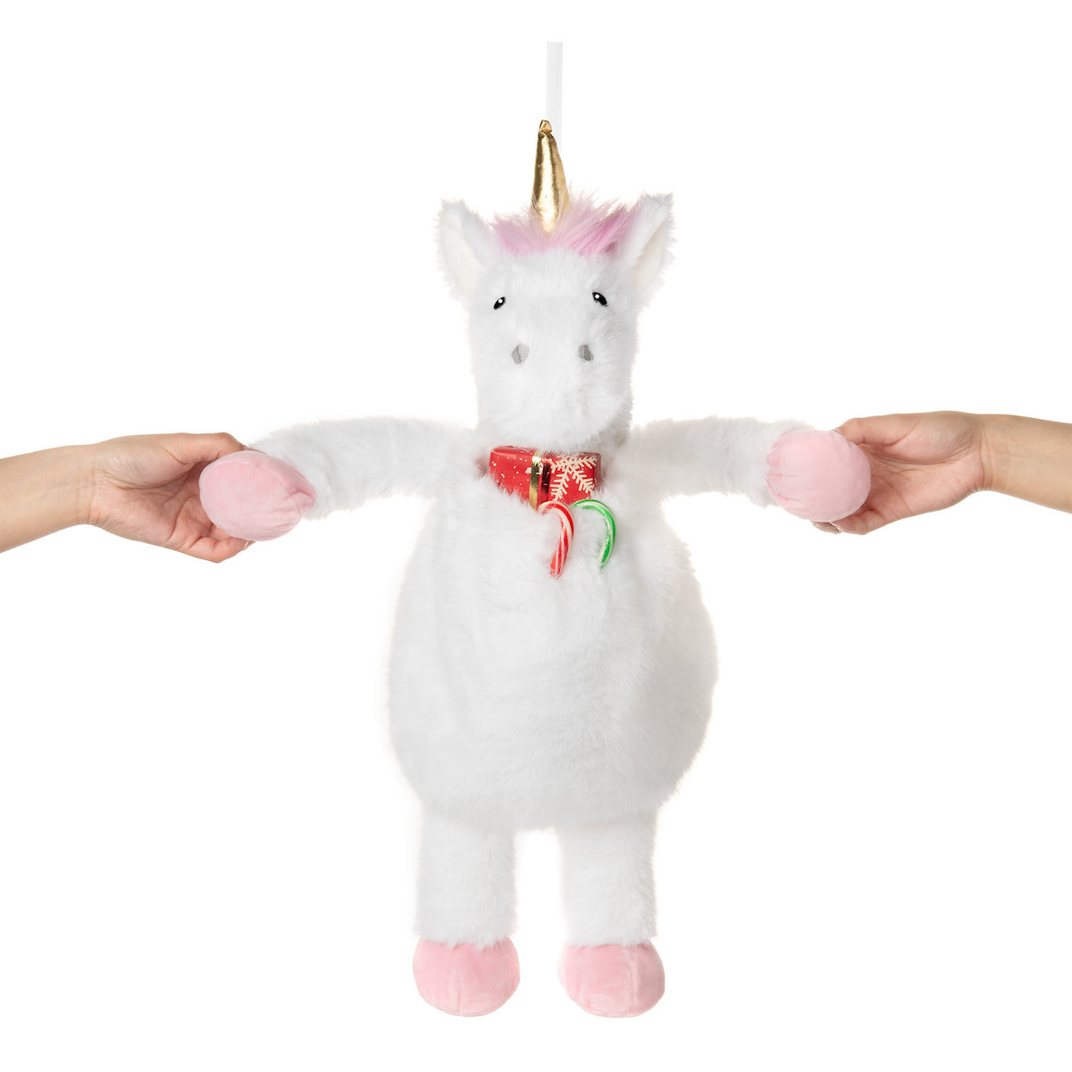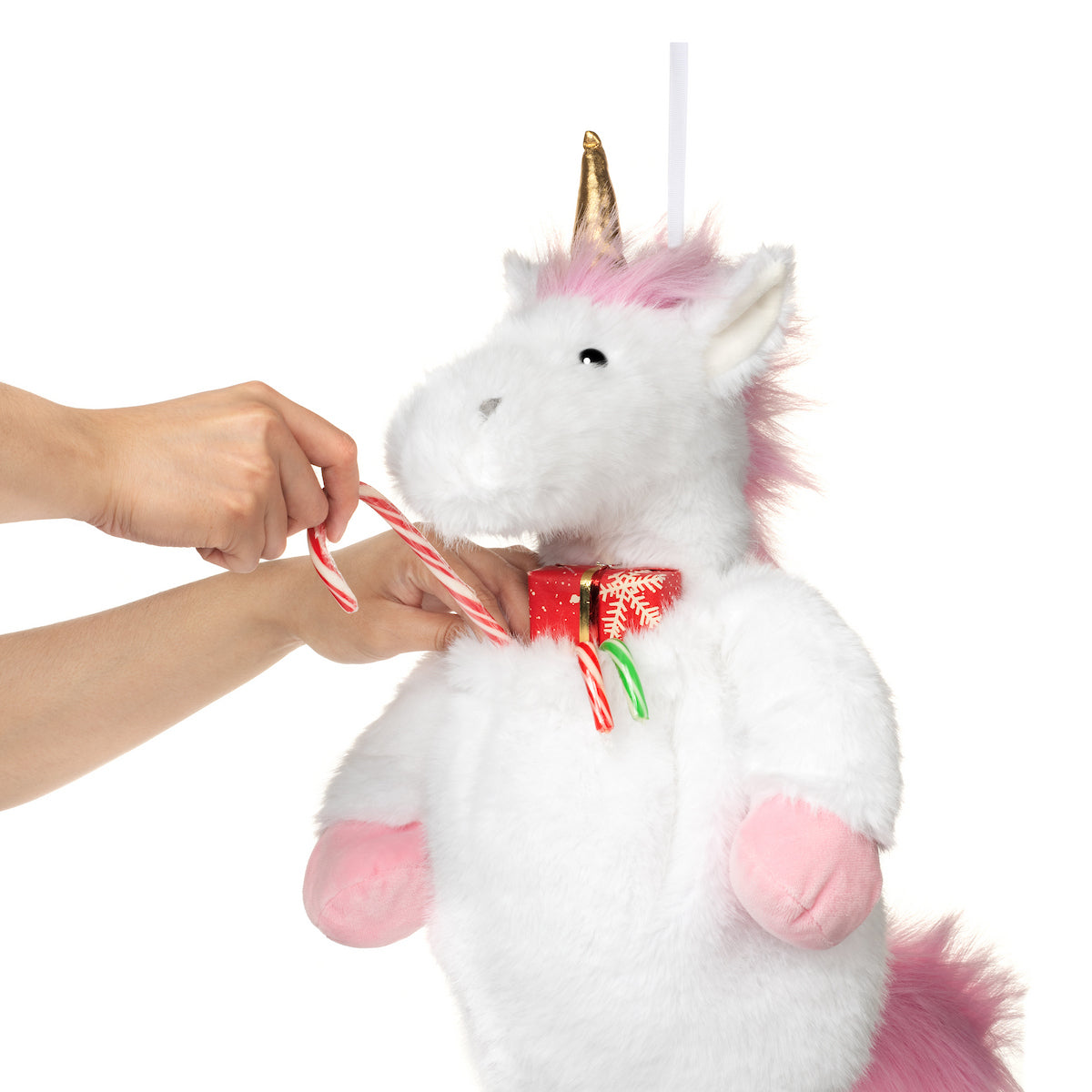 This unicorn stocking features a hidden pocket in the belly, so you can fill it with fun surprises. Simply expand the pocket by gently loosening the opening just under the neck, fill with gifts, then gently pull on both arms to tighten the pocket opening.
